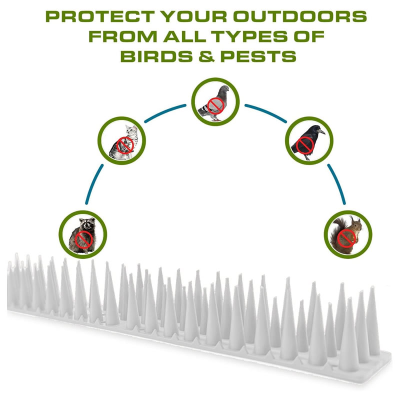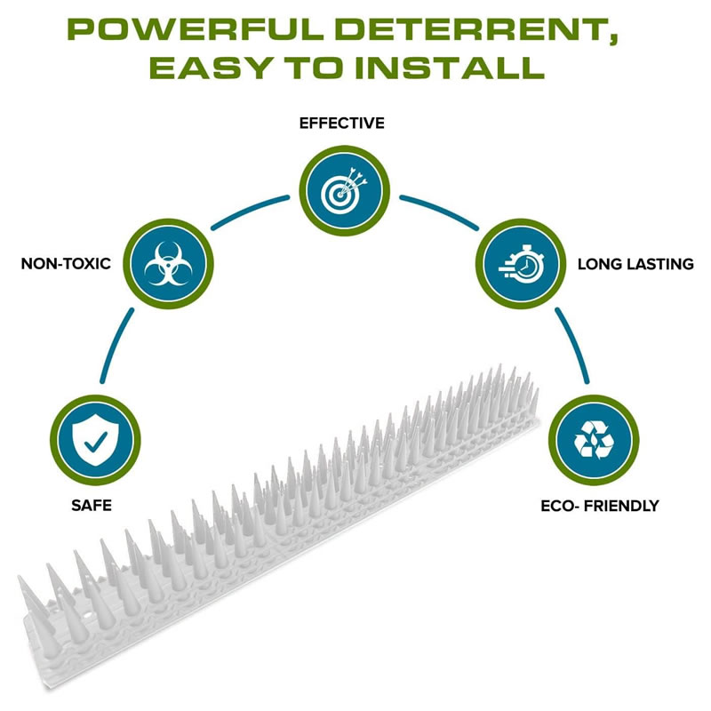• SIMPLE TO INSTALL: The spike strips are flexible for curved or uneven surfaces. There is a snap off break point, Our wall / fence spike strips have pre-drilled holes in the base; simply attach the bird spikes to the desired fence and boundary with screws or cable ties. Saving you time and effort while providing maximum protection.